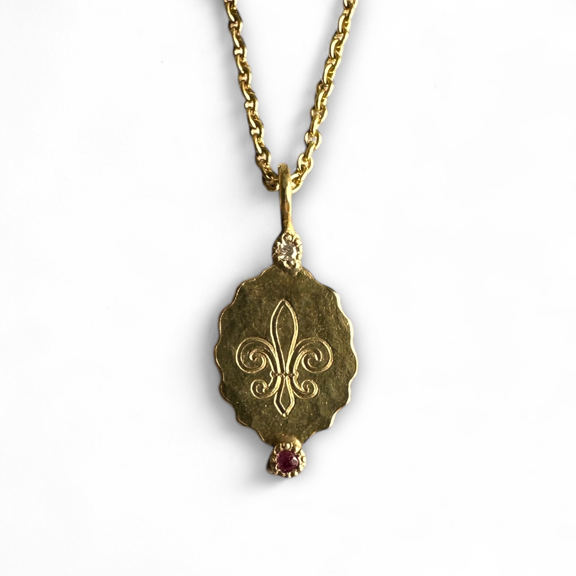 Ein edler, handgearbeiteter Anhänger aus recyceltem 18ct Gelbgold, verziert mit einer Gravur in Form einer Lilie – Symbol für Reinheit und Eleganz.
